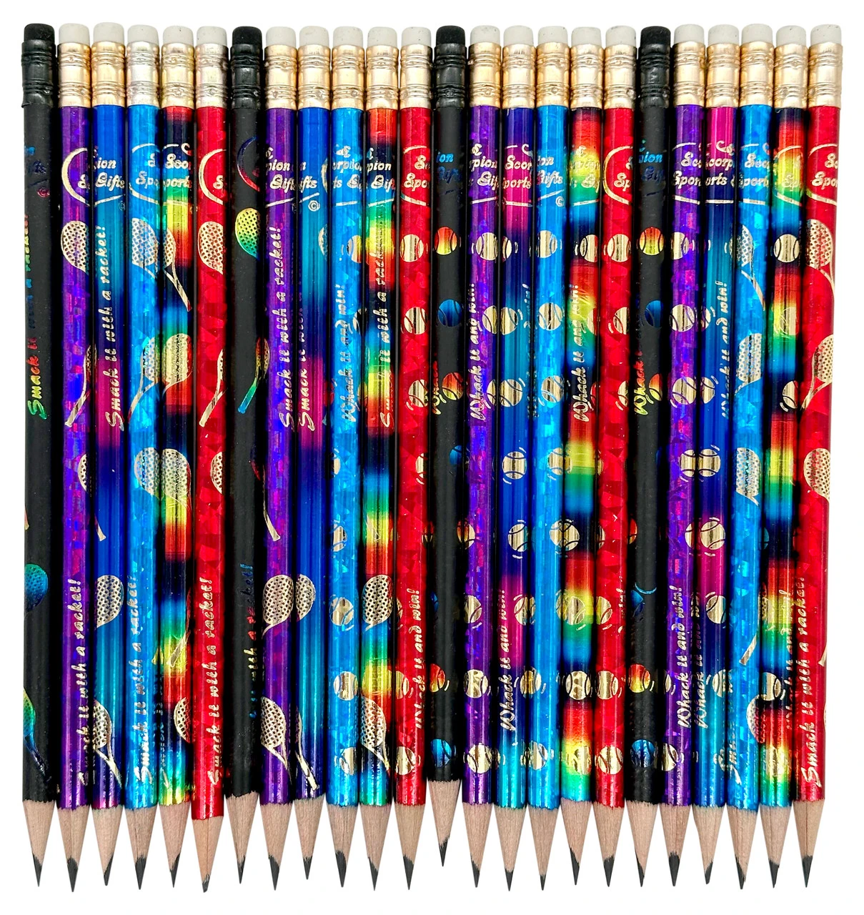 Tennis Themed Pencil with rubber tip at the end. Metallic, colourful pencils, all with a different tennis pattern and colour.