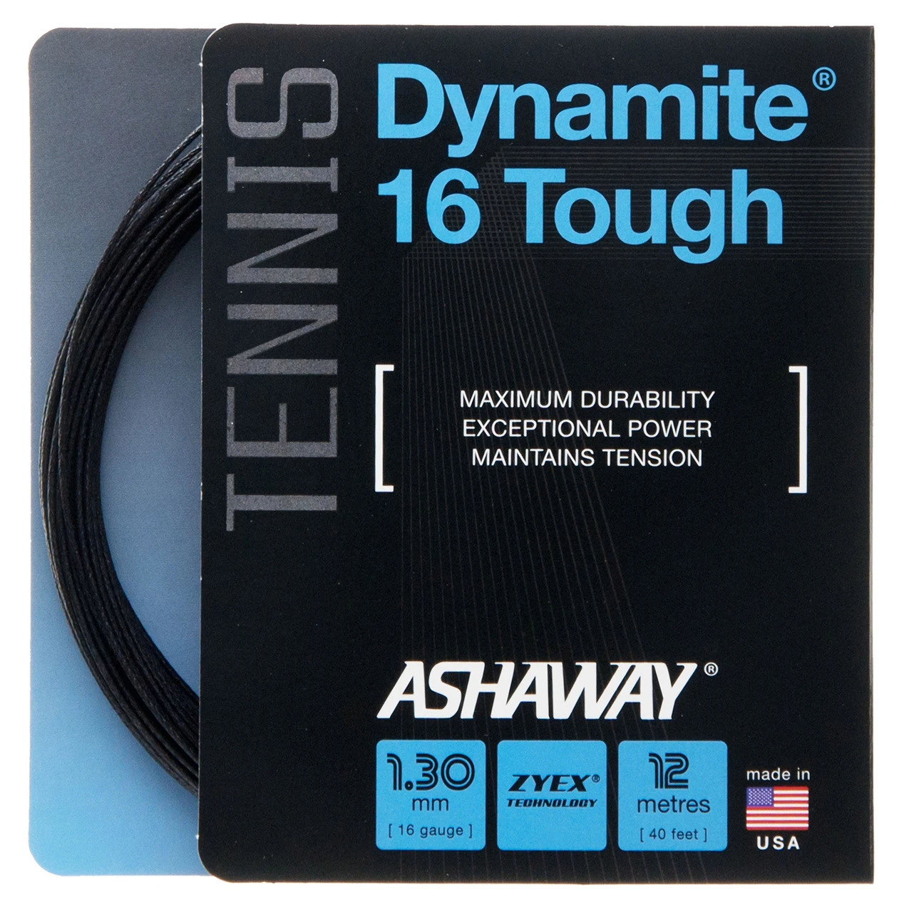 Ashaway Dynamite Tough offers maximum durability and exceptional power. Featuring a Zyex monofilament core to prevent tension loss and to increase power.